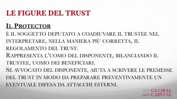 Il protector: è il soggetto deputato a coadiuvare il trustee nella corretta interpretazione del regolamento del trust. Rappresenta l’uomo del disponente, bilanciando in questo modo il trustee che, come abbiamo visto, è l’uomo dei beneficiari.